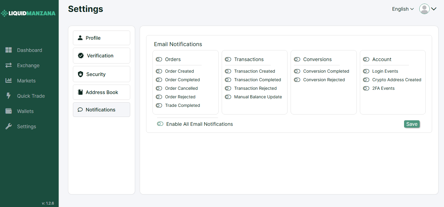 LiquidManzana Exchange Settings - Notifications OverviewLiquidManzana Settings Page