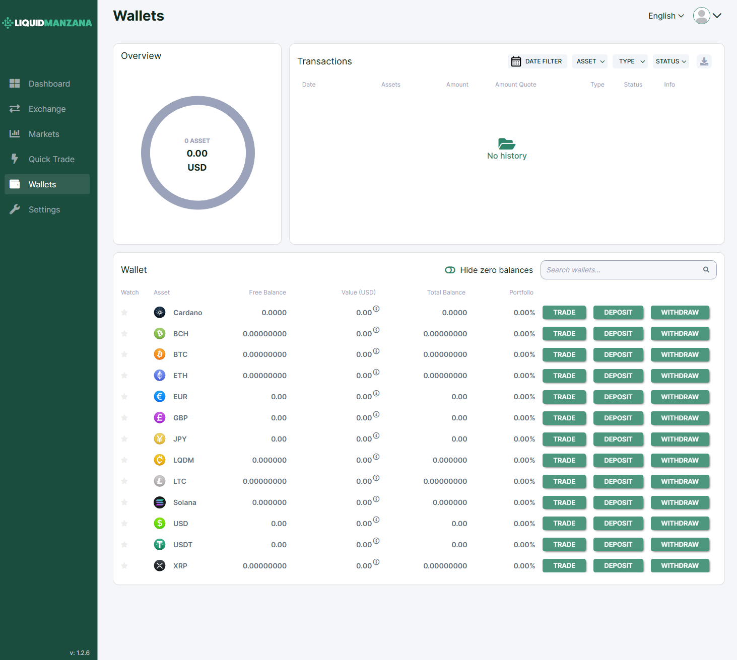 The Wallets page provides a comprehensive summary of all the cryptocurrencies and fiat currencies held in a user’s account on the LiquidManzana exchange. This interface supports balance visibility, deposit/withdrawal actions, and transaction history review.