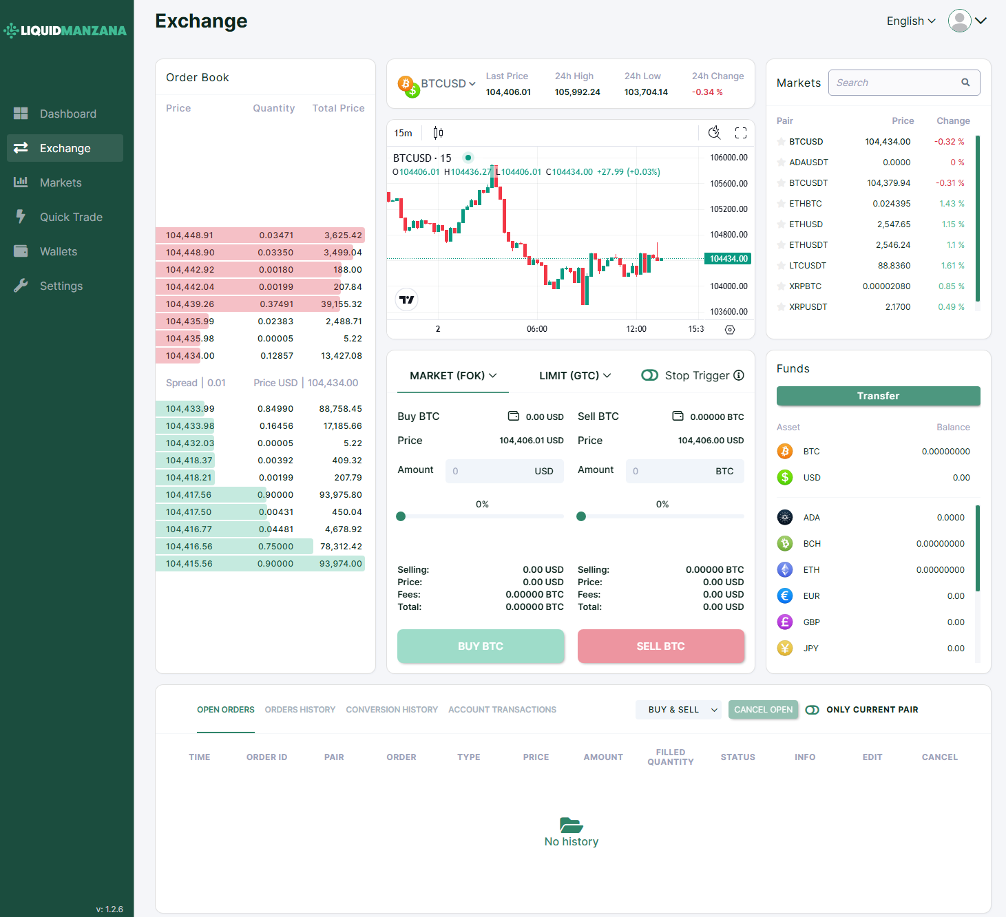 The LiquidManzana Exchange screen is a full-featured cryptocurrency trading interface where users can place trades, monitor price charts, review order books, and track market performance in real-time.
