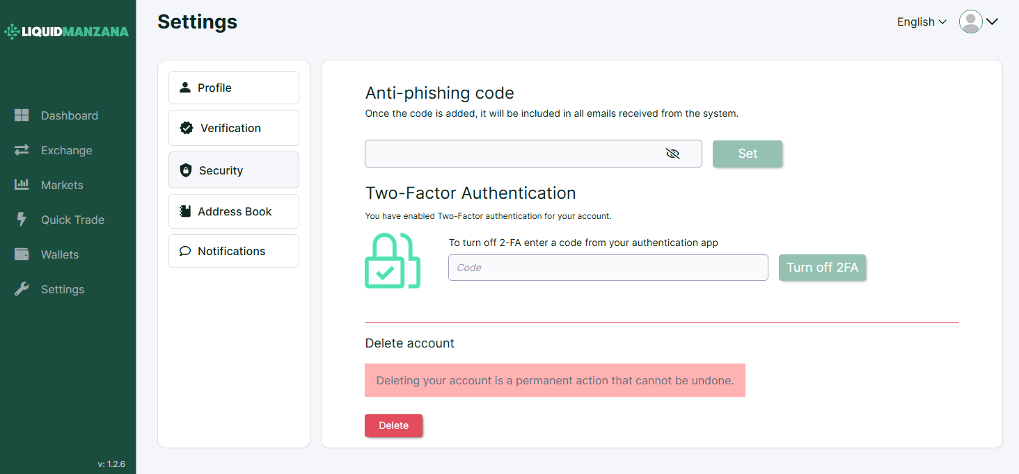 LiquidManzana Exchange Settings - Security OverviewLiquidManzana Settings Page