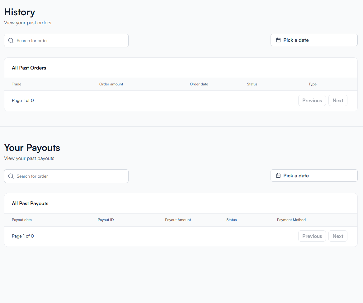 This section is your personal financial ledger, designed to provide clear and organized visibility into all historical orders and dividend-style payouts received from your real estate NFT investments.
