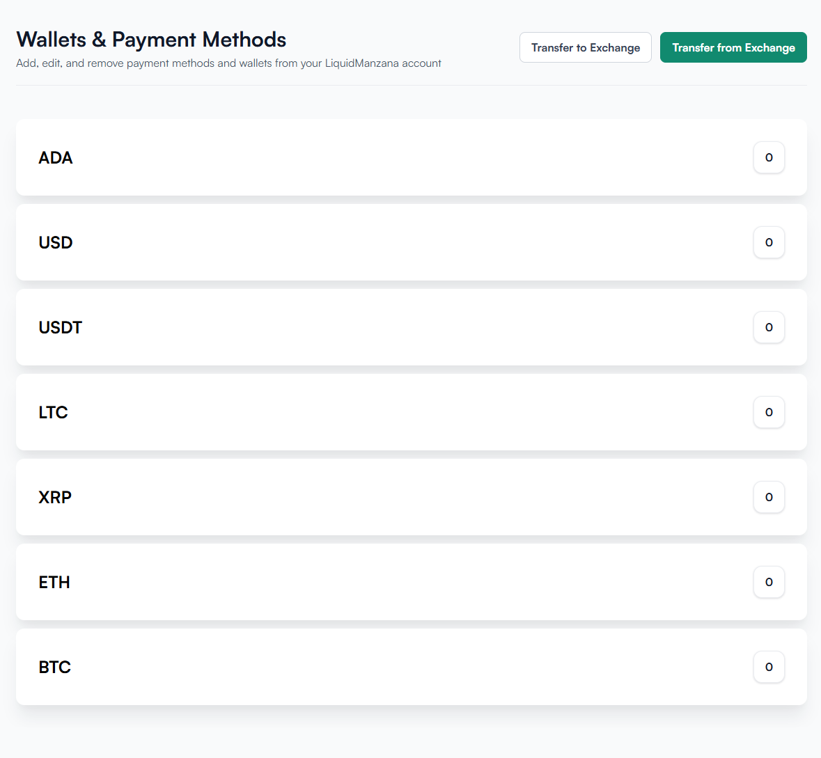 "Add, edit, and remove payment methods and wallets from your LiquidManzana account."